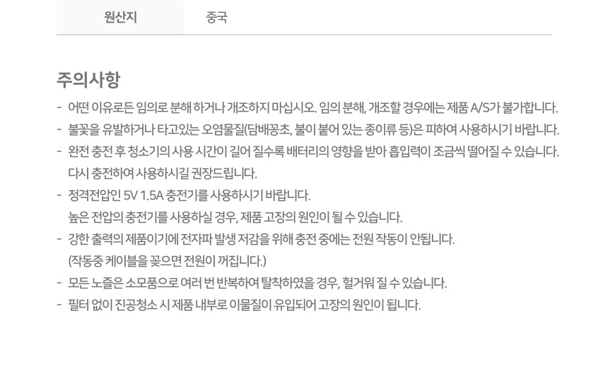 * 흡입력 및 최대 출력 : 6000pa / 50W / 55000RPM