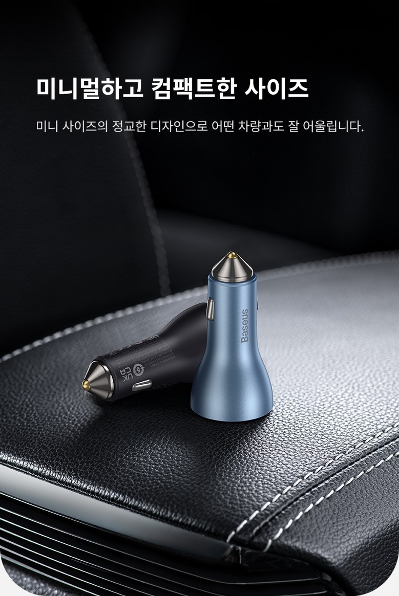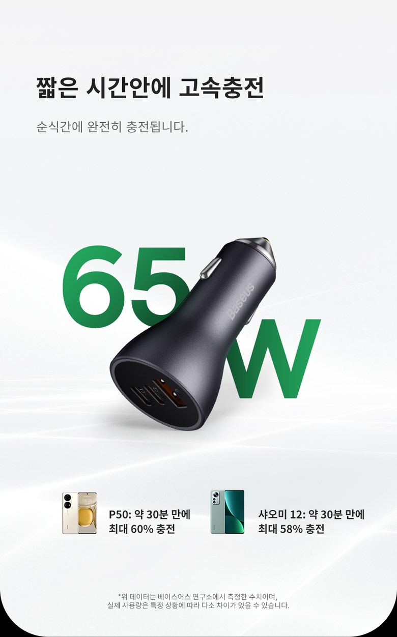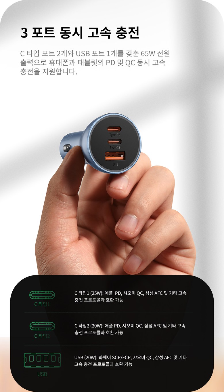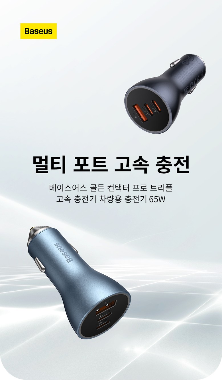 • 베이스어스 차량용 충전기 자동차 시거잭 차량 고속 충전 3포트 USB C타입 65W