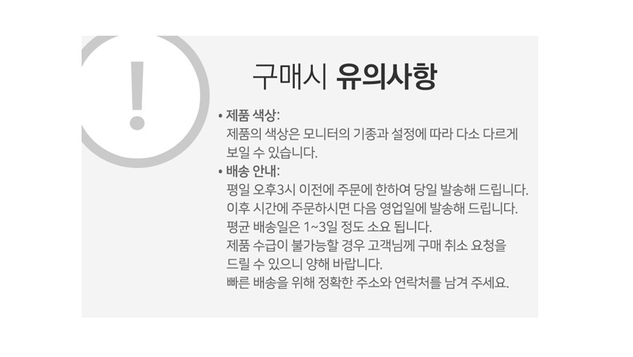 • 주문된 상품은 제품과 수량에 따라 다소 차이가 있으나, 보통 발주일로부터 3~7일 이내 배송을 원칙으로 합니다.