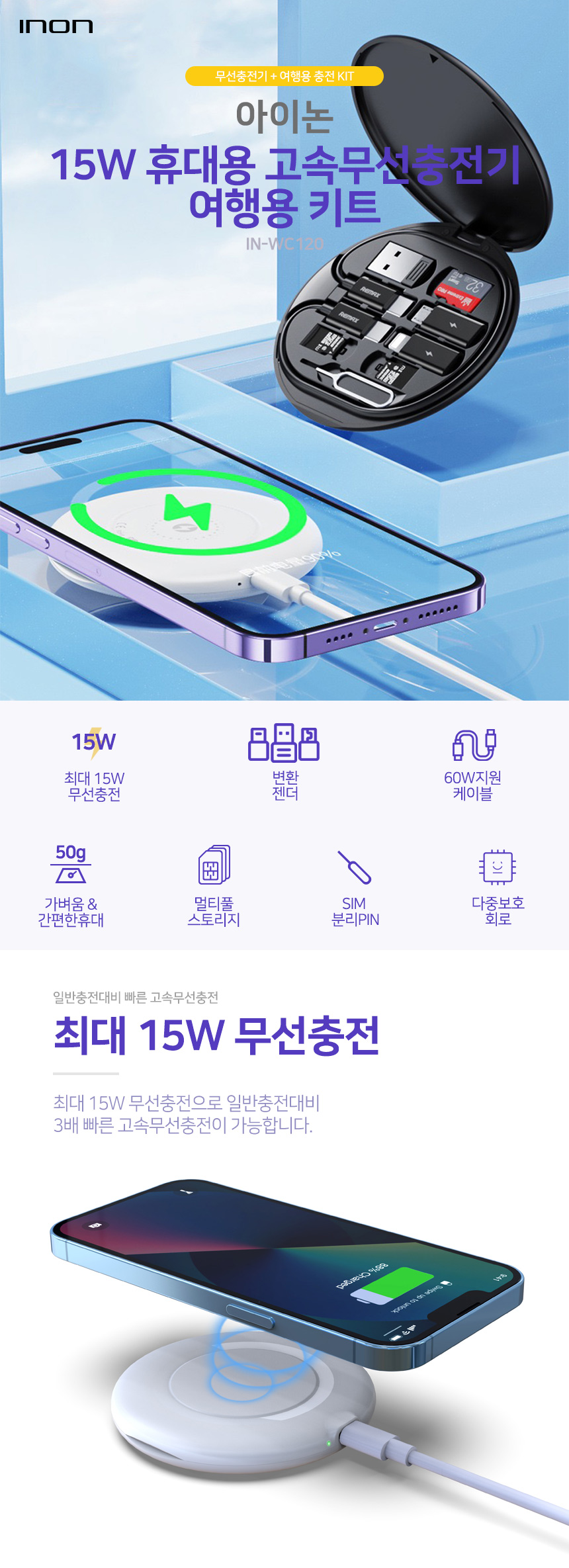 • 아이논 INON 여행용 15W 고속 무선충전기 키트 IN-WC120