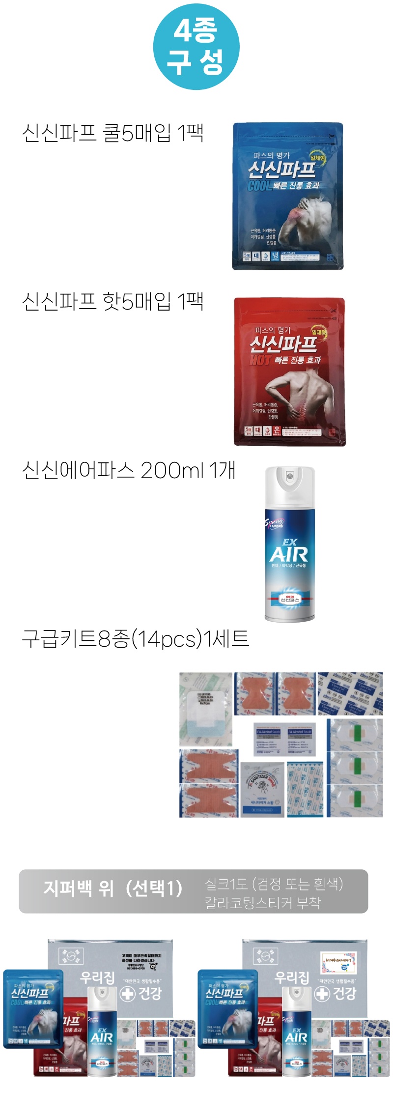 신신파프5매일체형 쿨1팩, 신신파프5매일체형 핫1팩, 신신스프레이에어파스200ml 1개, 구급키트8종(14pcs)1개,반투명지퍼백