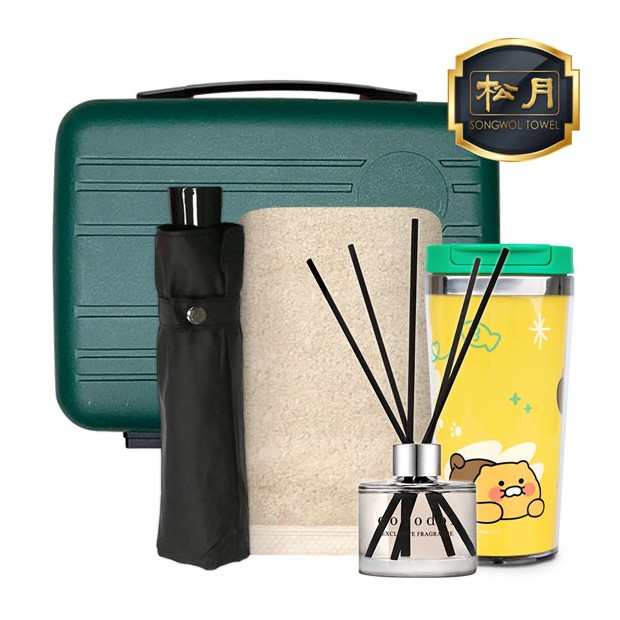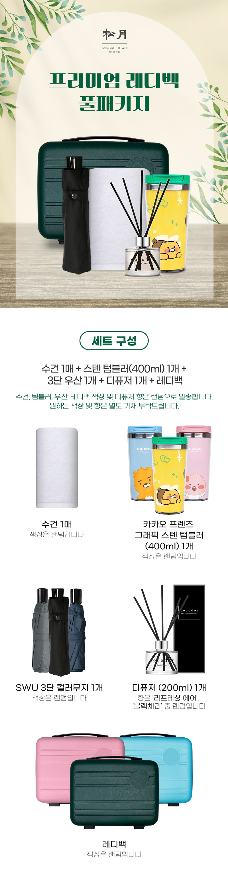 40수 160g 1매 타올 + 카카오프렌즈 그래픽 스텐텀블러 (400ml) 1개 + 3단 SW 컬러무지 우산 1개 + 코코도르 디퓨저(200ml) 1개 + 레디백