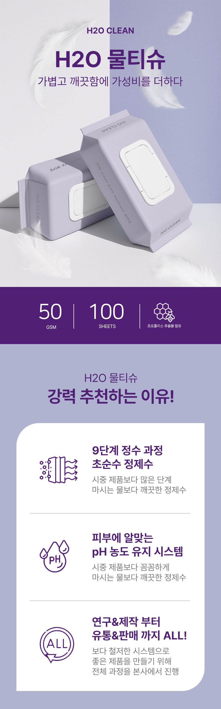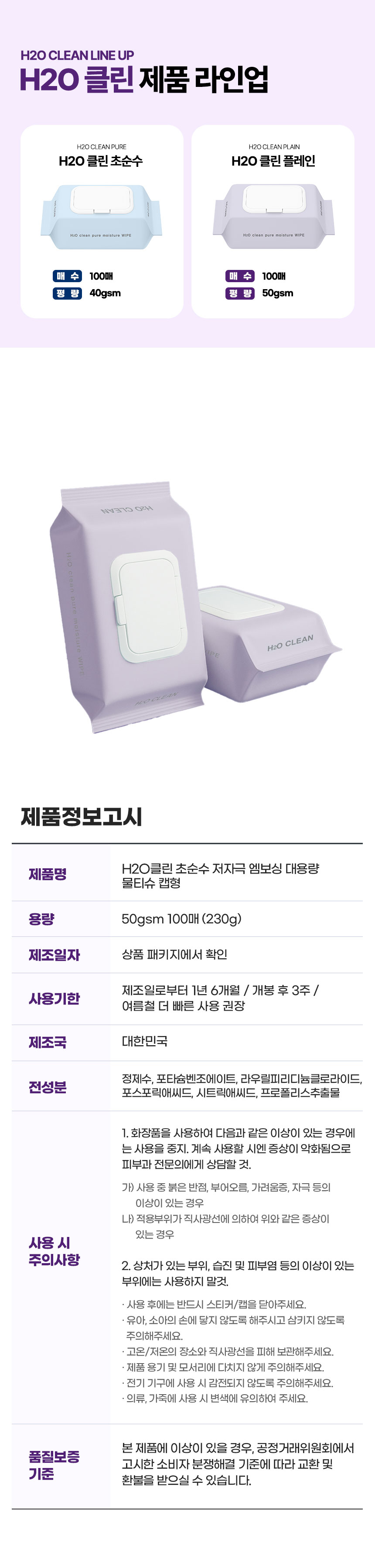 • H2O클린 초순수 저자극 대용량 엠보싱 캡형 물티슈 50평량 100매 1팩