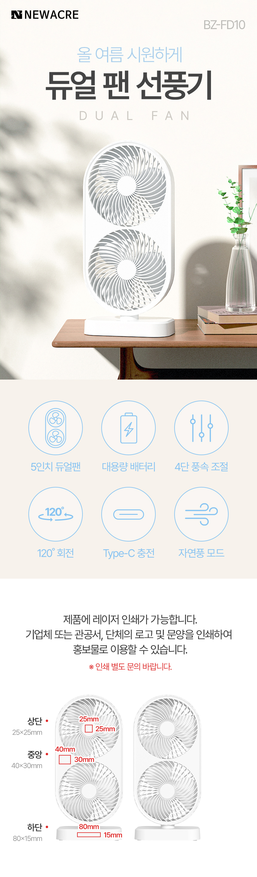 •  뉴에이커 듀얼 팬 무선 선풍기 탁상형 탁상용 사무실 캠핑 책상용 선풍기