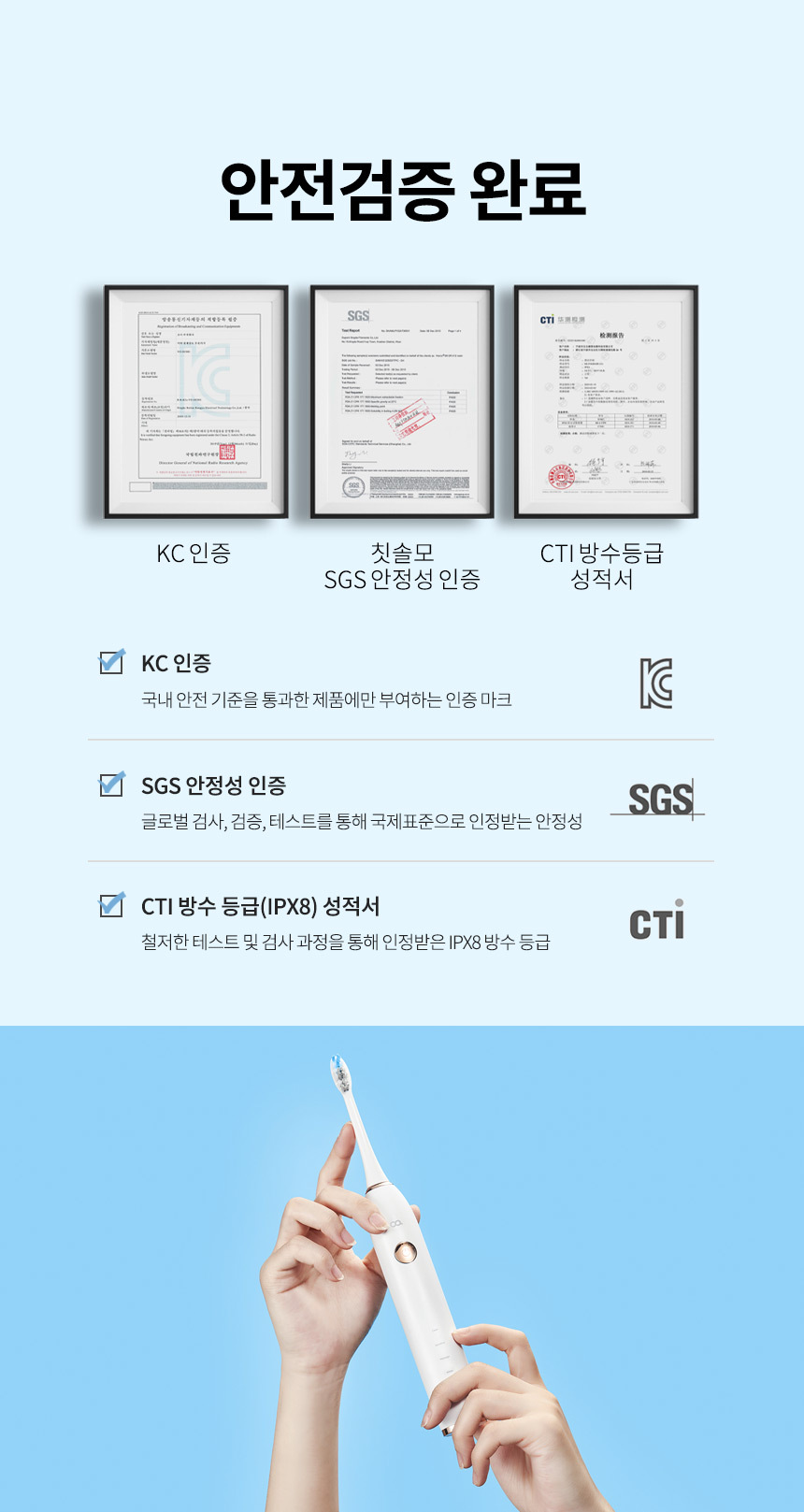 본품, 칫솔모 2개, 본체팁 보호캡 1개, 무선충전크래들, 휴대용케이스, 방수스티커, 설명서