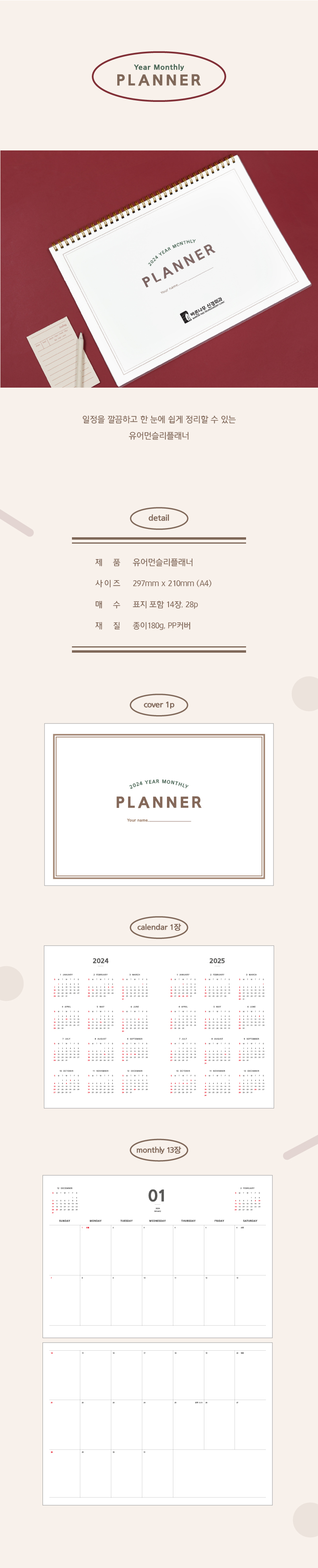 앞,뒷면 투명 PP커버(2p), 먼슬리 플래너(표지포함 14장 28p)
