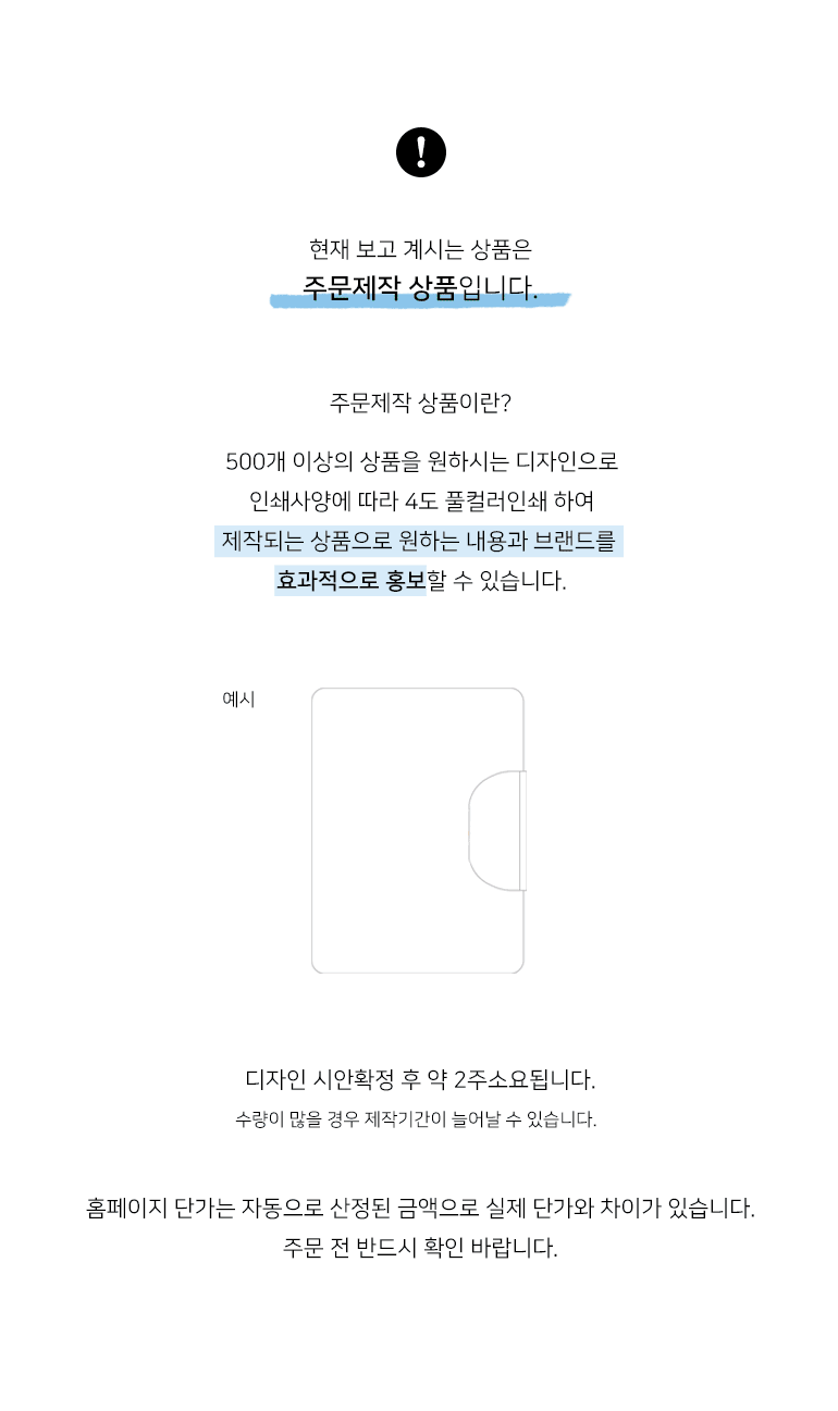 • 국내택배 배송비는 무료배송을 원칙으로 하나 제작상품에 따라 상이하게 적용될 수 있습니다.