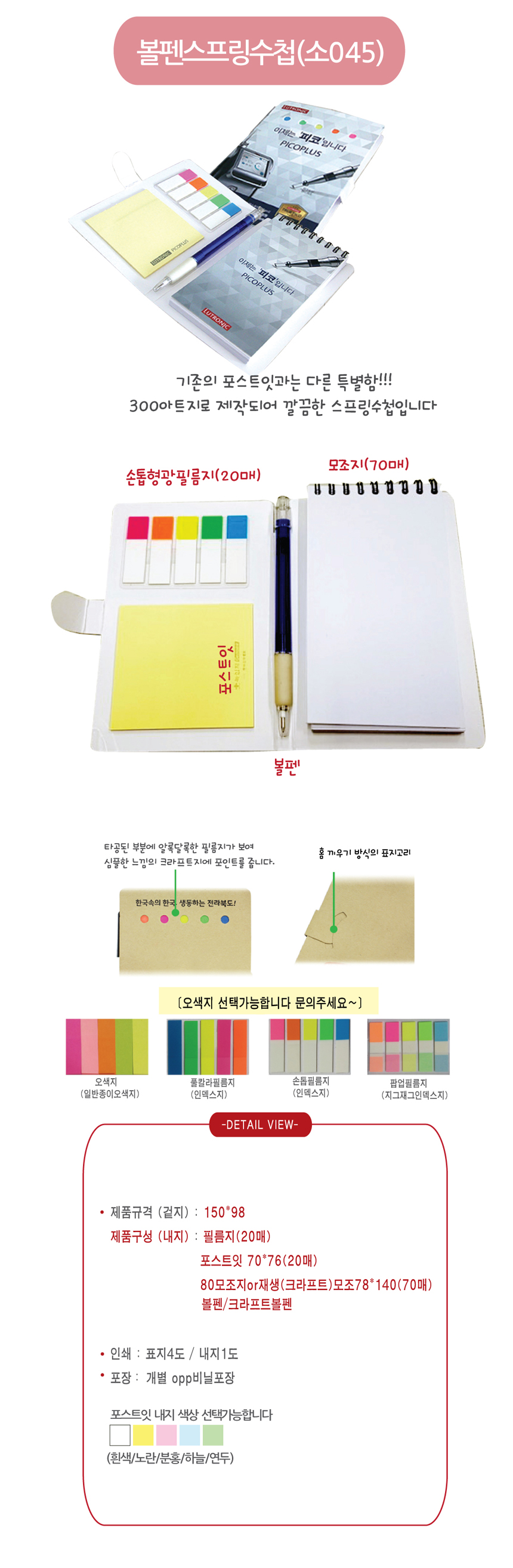 겉지:150*98 / 내지: 필름지(20매) , 포스트잇:70*76(20매) , 모조78*140(70매)