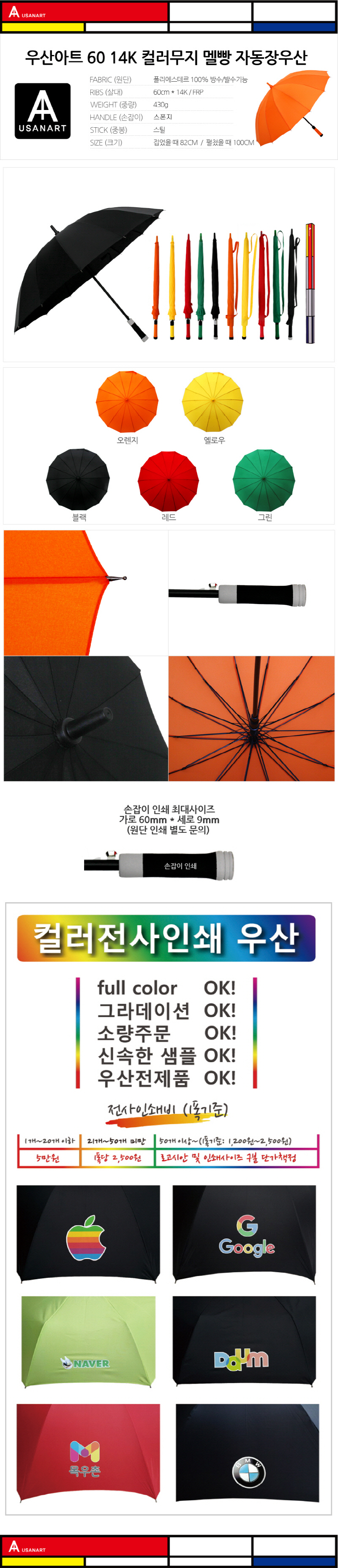 • 우산아트 60 14K 컬러무지 멜빵 우산