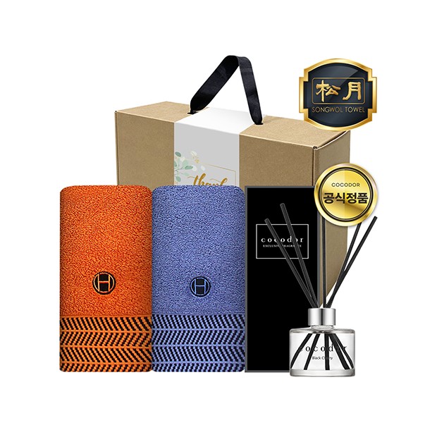송월타월2장, 코코도르 디퓨저 1개, 일체형 손잡이박스, 속지, 감사스티커(랜덤)
