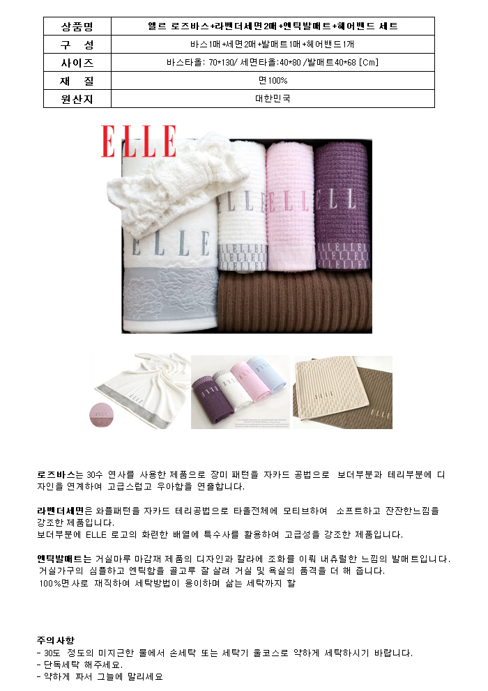 • 엘르 로즈바스+라벤더세면3매+발매트+헤어밴드 세트