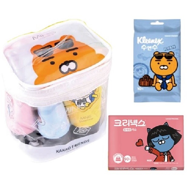 카카오프렌즈 5종 미니스 여행용세트1개, 크리넥스 카카오프렌즈 미용티슈50매 1개, 크리넥스 카카오프렌즈 수앤수 물티슈10매 1개, 손잡이고급형케이스1개