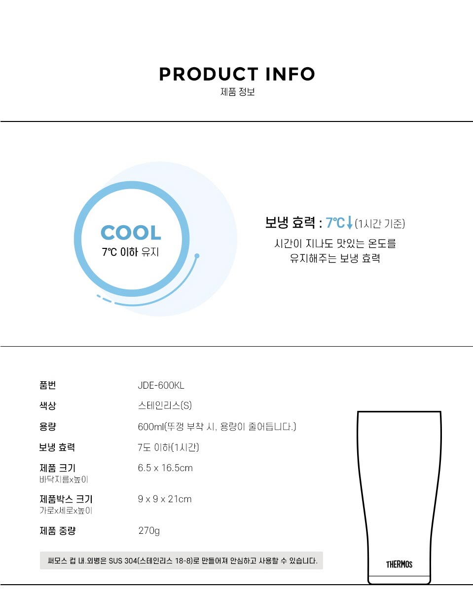 • 써모스 진공단열 스탠다드 콜드컵 JDE-600KL-뚜껑포함