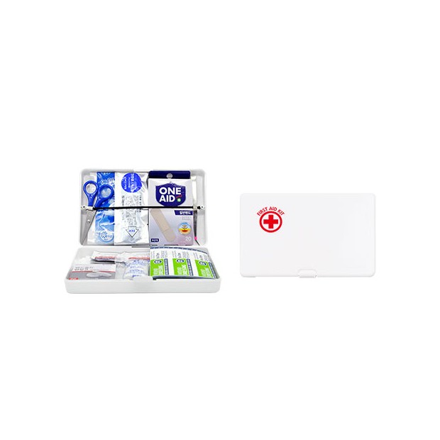 알콜스틱1,가위1,핀셋(금속),드레싱밴드(6*7),드레싱밴드(4.5*5.5)2개입,알콜스왑6p,반창고1,면봉10p,솜6p,거즈붕대(5cm),멸균거즈5cm,멸균면봉2개입,냉각시트1,표준형밴드1