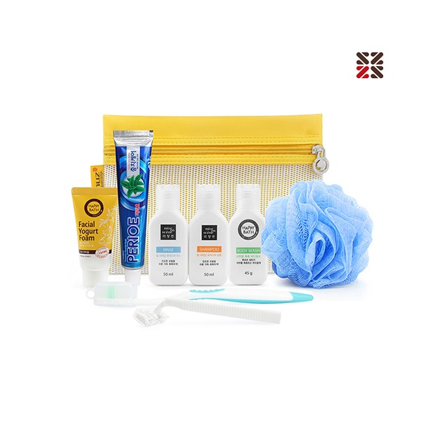 미장센샴푸50g, 미장센린스50g, 해피바스바디45g, 해피바스클렌징폼30g, 메디안치약50g, 메디안칫솔, 면도기, 샤워볼, 종이케이스