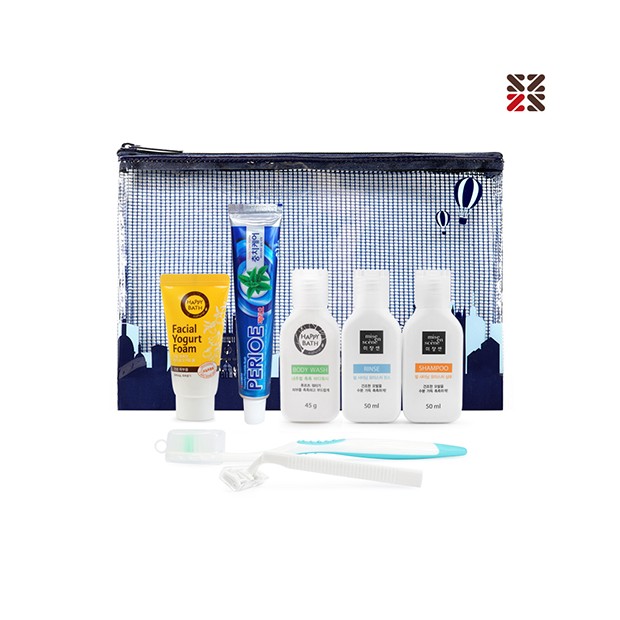 미장센샴푸50g, 미장센린스50g, 해피바스바디45g, 해피바스클렌징폼30g, 페리오치약50g, 메디안칫솔, 면도기, 종이케이스