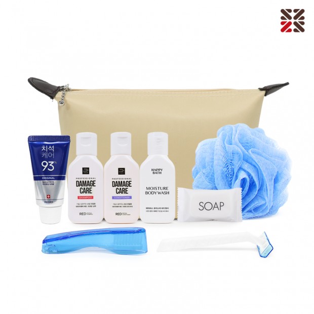 미장센샴푸50g, 미장센린스50g, 해피바스바디45g, 비누, 칫솔, 치약40g, 면도기, 샤워볼, 종이케이스
