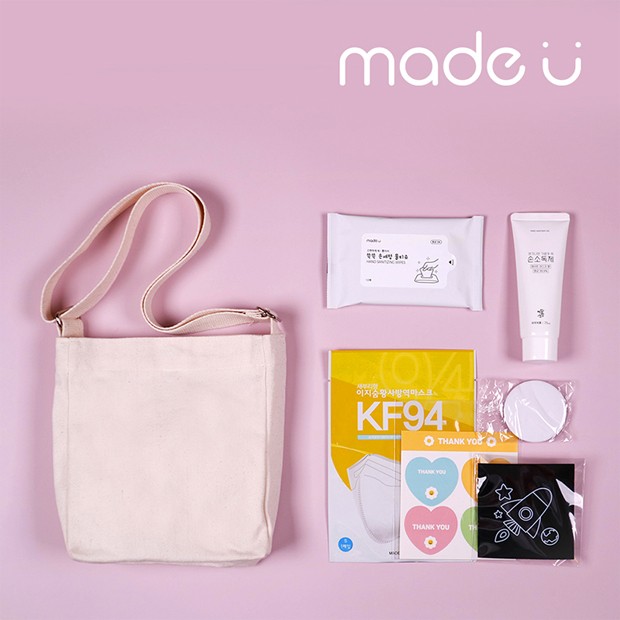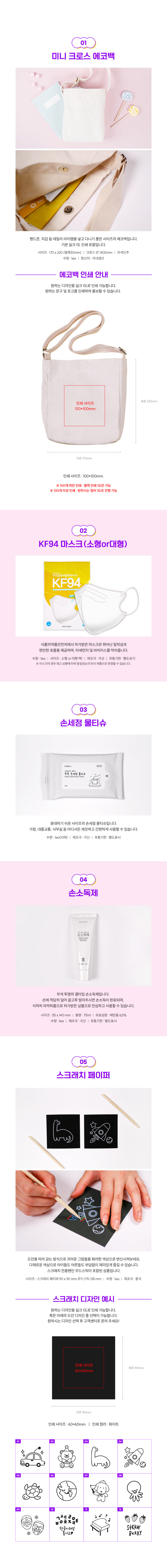 미니크로스에코백,KF94마스크(소형or대형),손세정물티슈,백점생활손소독제,원형뱃지,제작형스티커,스크래치페이퍼(스틱포함)