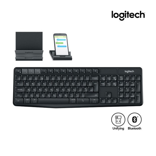 키보드, 스마트폰 및 태블릿 거치대, aaa배터리 2개, 무선 수신기, 설명서 / 블랙