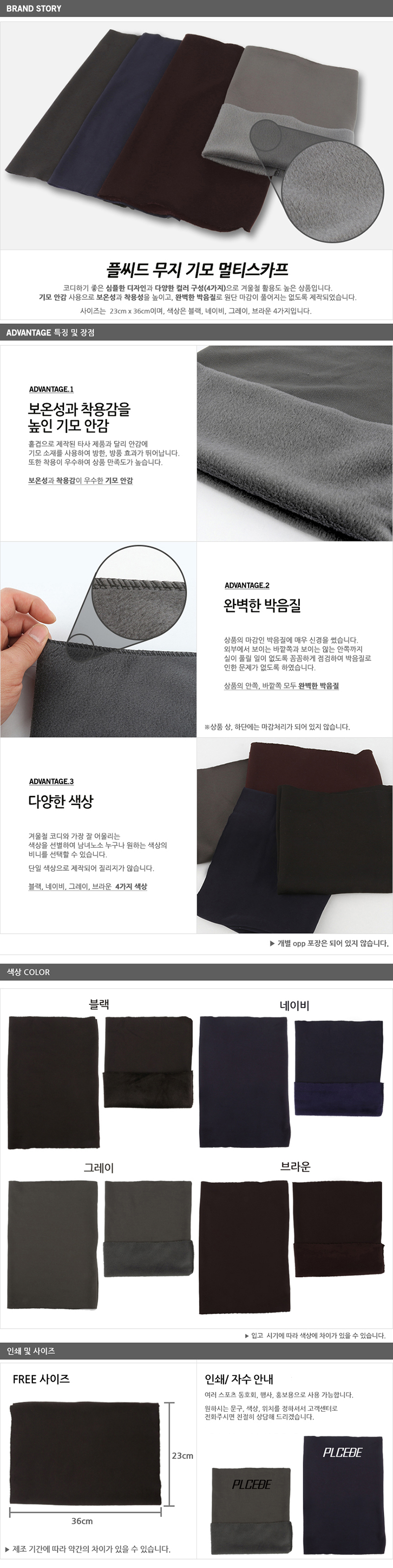 무지 기모 멀티스카프(벌크) / 블랙, 네이비, 그레이, 브라운