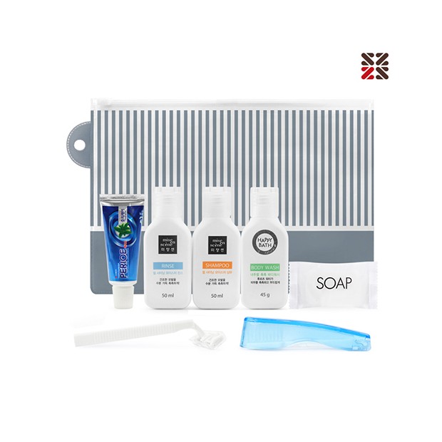 미장센샴푸50g, 린스50g, 해피바스바디45g, 비누, 칫솔, 치약20g, 면도기