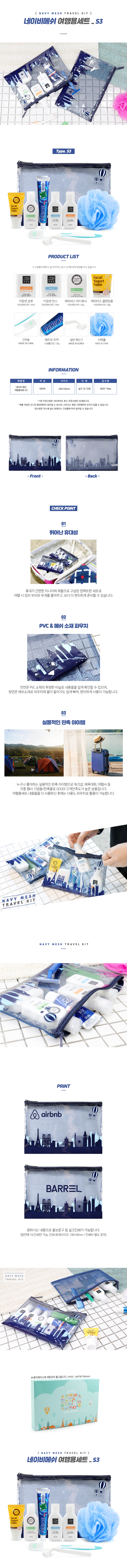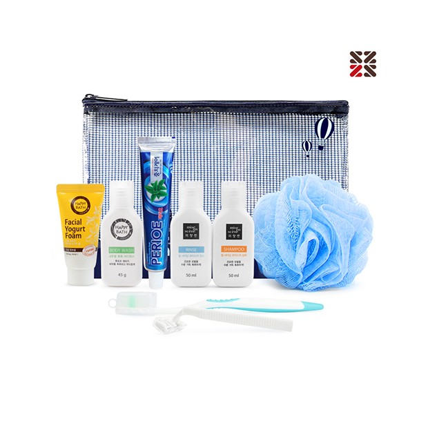 미장센샴푸50g, 미장센린스50g, 해피바스바디45g, 해피바스클렌징폼30g, 페리오치약50g, 메디안칫솔, 면도기, 샤워볼, 종이케이스