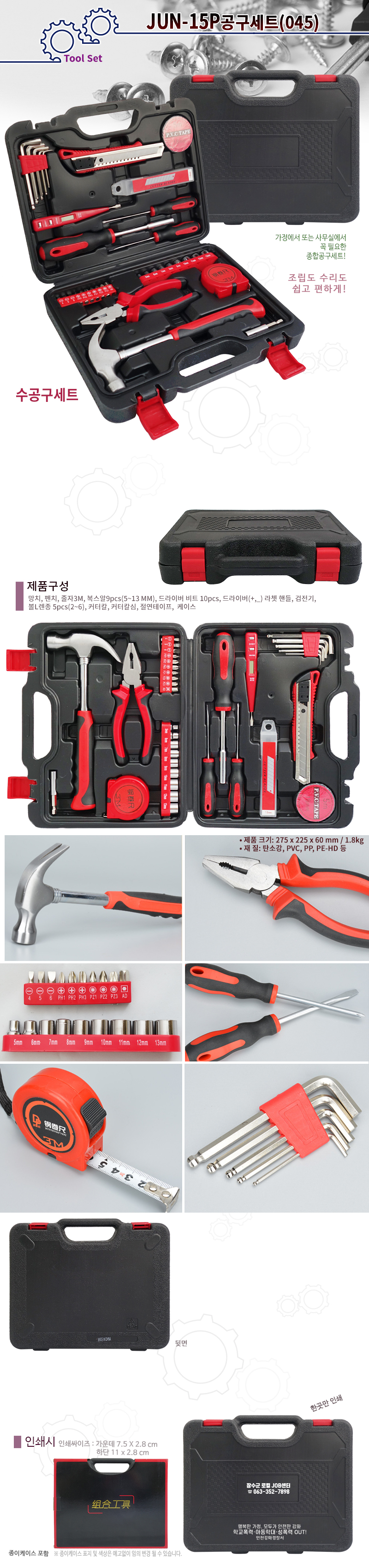 15pcs(망치, 펜치, 줄자3M, 복스알9pcs(5~13 MM), 드라이버 비트 10pcs, 드라이버(+,_) 라쳇 핸들, 검전기, 볼L렌종 5pcs(2~6), 커터칼, 커터칼심, 절연테이프, 케이스)