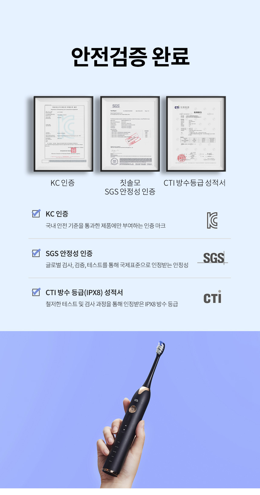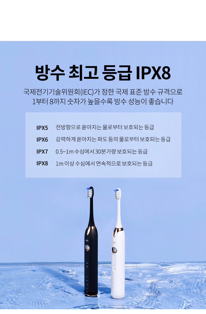 본품, 칫솔모 2개, 본체팁보호캡 1개, 무선충전크래들, 휴대용케이스, 방수스티커, 설명서