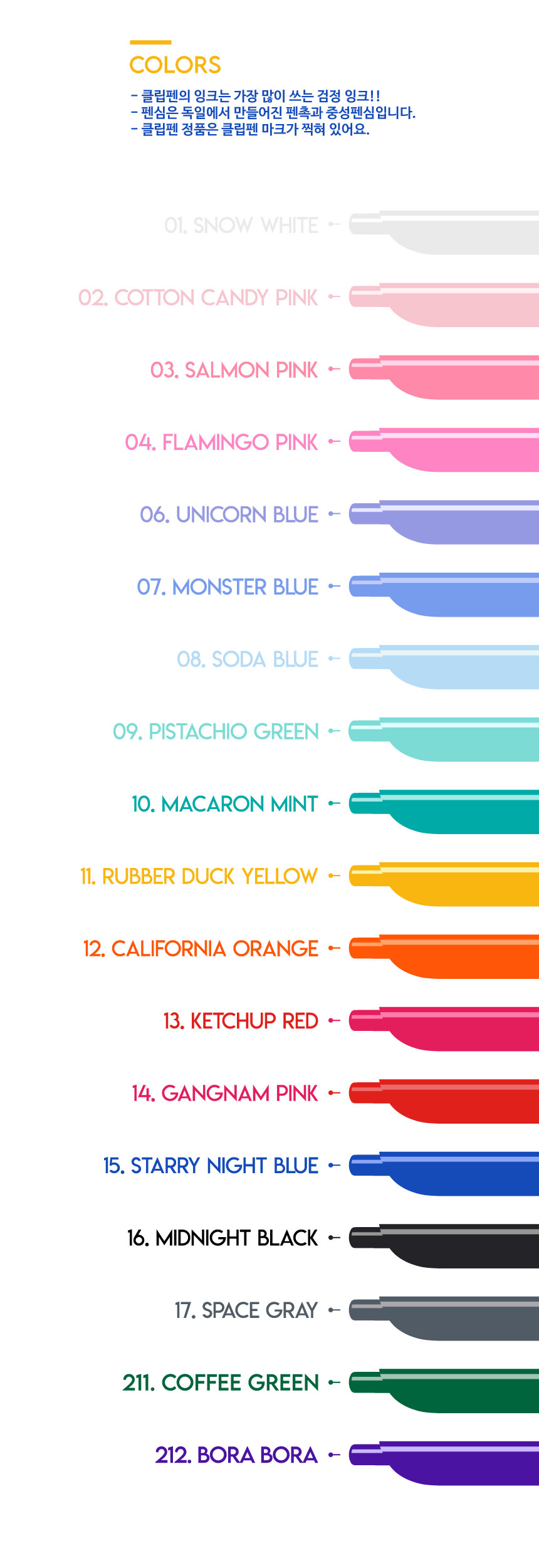 ★ 총 17가지 색상이며 모든 색상의 잉크는 검정색입니다.