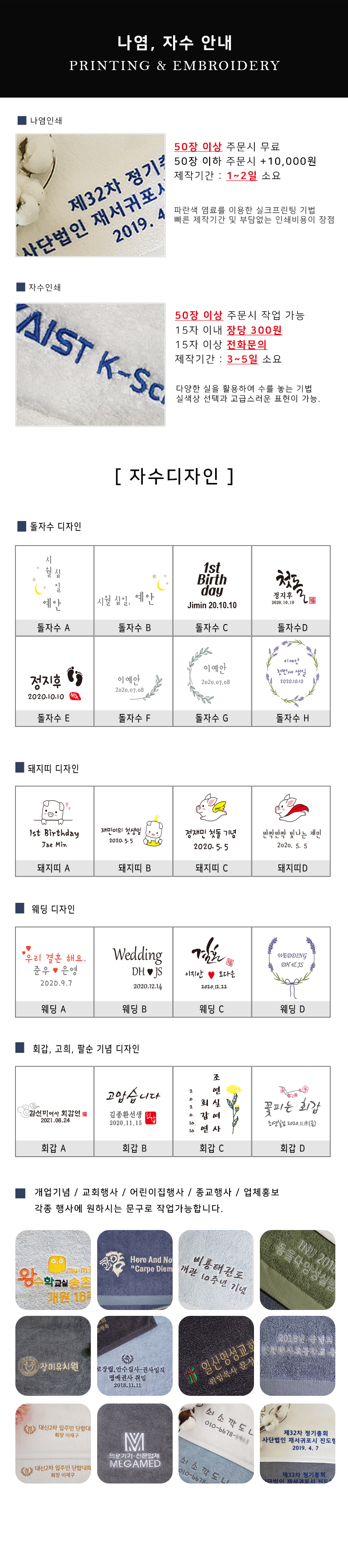 자수인쇄의 경우 글자수,크기,난이도에 따라 비용이 추가될 수 있으니 꼭! 사전에 문의 바랍니다.