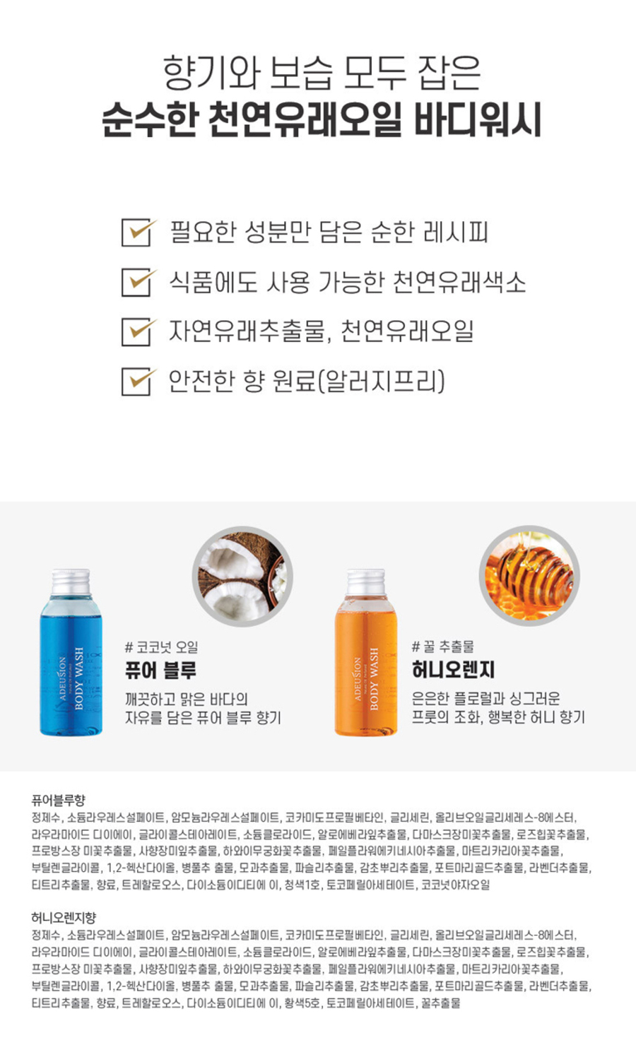 칫솔: 헤드 26mm(H), 총길이 18cm / 치약: 75g / 바디워시: 100ml