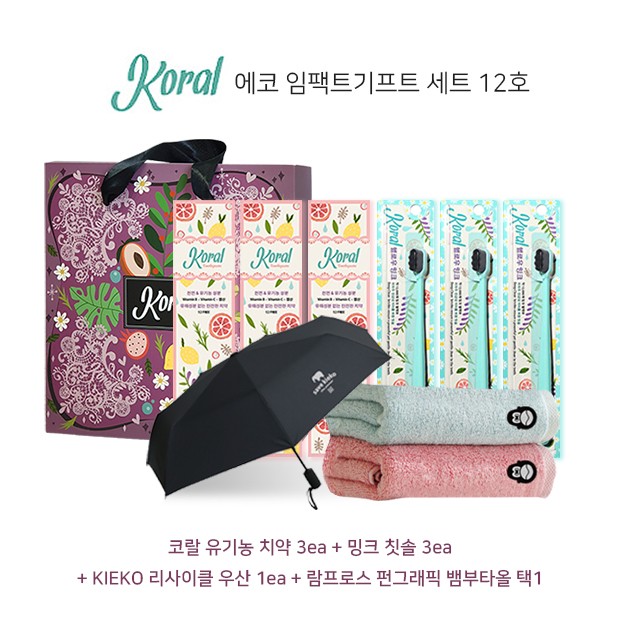 코랄 유기농 치약 3ea+밍크 칫솔 3ea+람프로스 펀그래픽 뱀부타올 택1+KIEKO 리사이클 우산 1ea