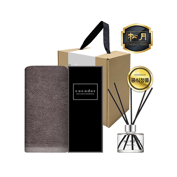송월타월1장, 코코도르 디퓨저 1개, 일체형 손잡이박스, 속지, 감사스티커(랜덤)
