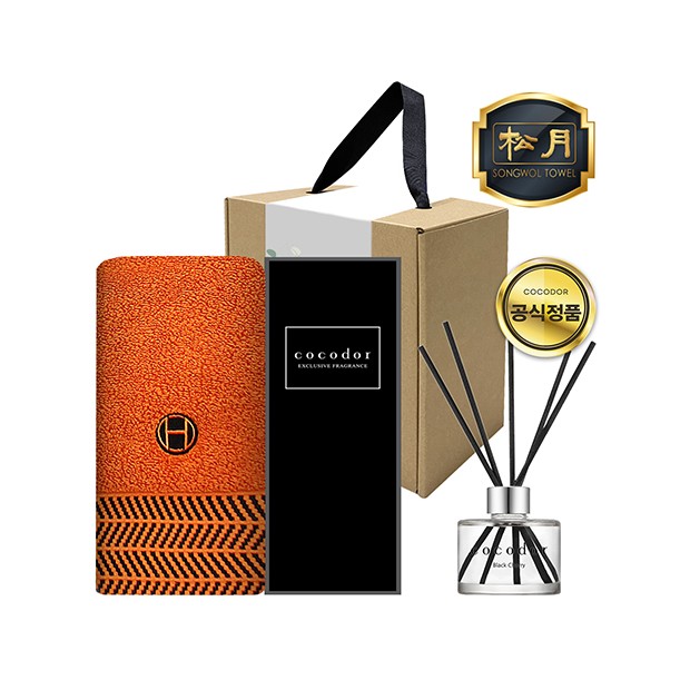 송월타월1장, 코코도르 디퓨저 1개, 일체형 손잡이박스, 속지, 감사스티커(랜덤)