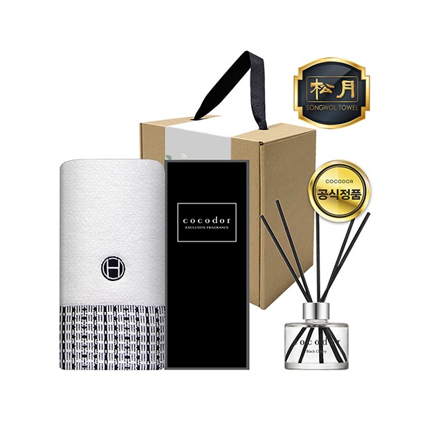 송월타월1장, 코코도르 디퓨저 1개, 일체형 손잡이박스, 속지, 감사스티커(랜덤)