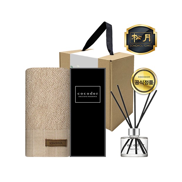 송월타월1장, 코코도르 디퓨저 1개, 일체형 손잡이박스, 속지, 감사스티커(랜덤)