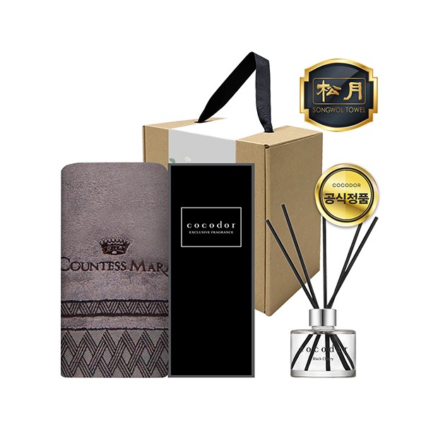 송월타월1장, 코코도르 디퓨저 1개, 일체형 손잡이박스, 속지, 감사스티커(랜덤)