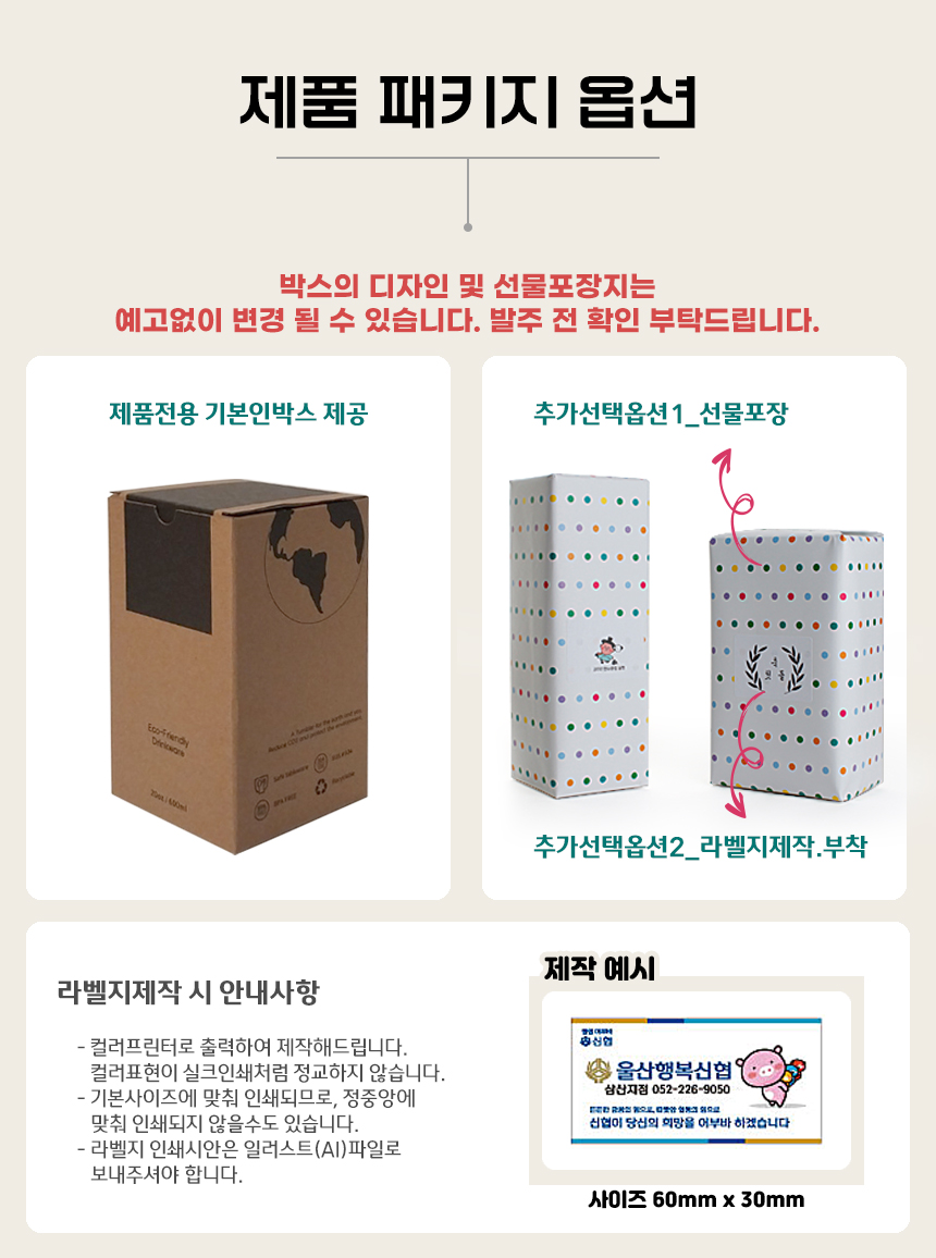 • 국내택배 배송비는 무료배송을 원칙으로 하나 제작상품에 따라 상이하게 적용될 수 있습니다.