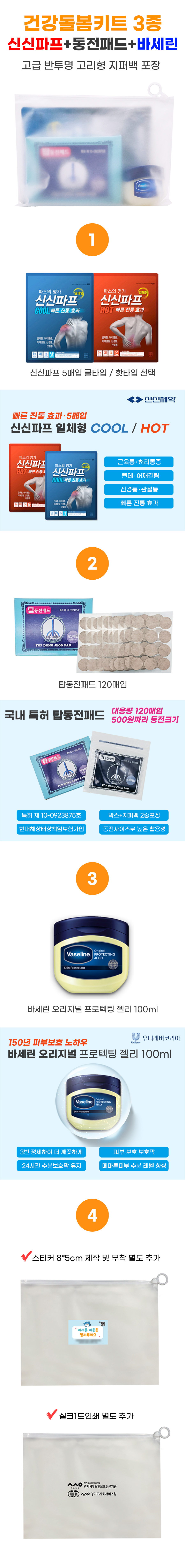 반투명고급고리형지퍼백 1개+신신파프5매입(핫 또는 쿨 지정) 1개+탑동전패드120매입 1개+바세린100ml 1개
