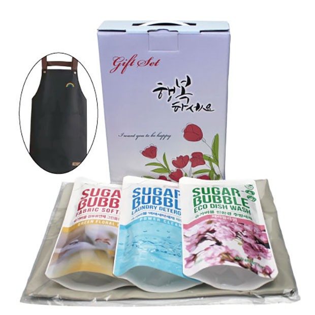• 고급형 방수 앞치마 + 슈가버블 주방세제 리필 + 슈가버블 세탁세제 리필 + 슈가버블 섬유 유연제 리필 4종세트
