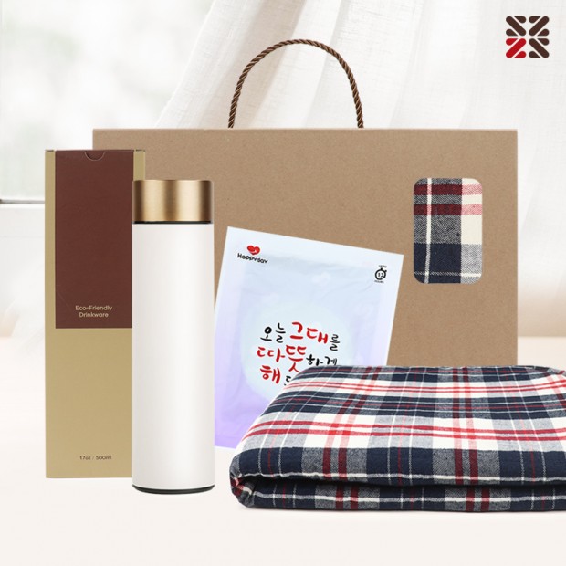 타탄패턴더블양면담요1p+부직포백+텀블러500ml 1p+핫팩1p+종이케이스