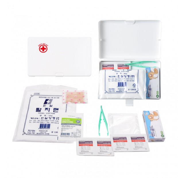 드레싱밴드(4.5*5.5cm)1,핀셋(플라스틱)1,알콜스왑4,밴드8p,위생장갑1,솜10g1,면봉10p