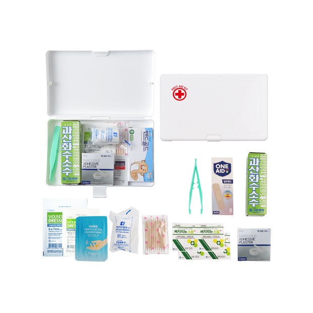 드레싱밴드1,핀셋,반창고,면봉,과산화수소수1,거즈붕대1,알콜스왑4,밴드8p