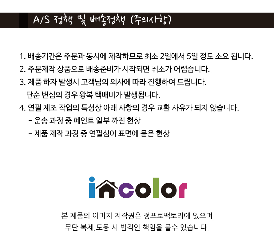 • 국내택배 배송비는 무료배송을 원칙으로 하나 제작상품에 따라 상이하게 적용될 수 있습니다.